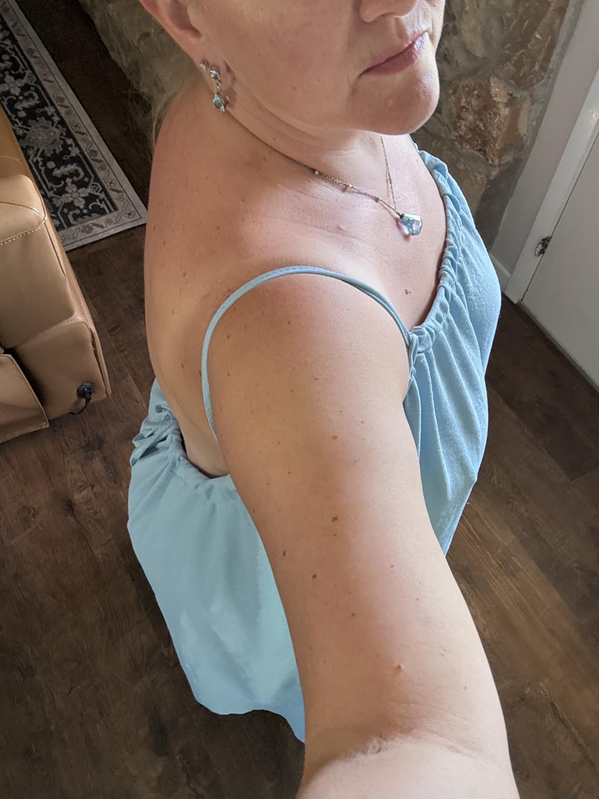 Elegant and incredibly comfortable! The straps are adjustable which is perfect for my body type. The fabric has a beautiful sheen and the color is exactly as pictured. I've worn it to brunches, dinners, and even a beach party. It's my new favorite dress!