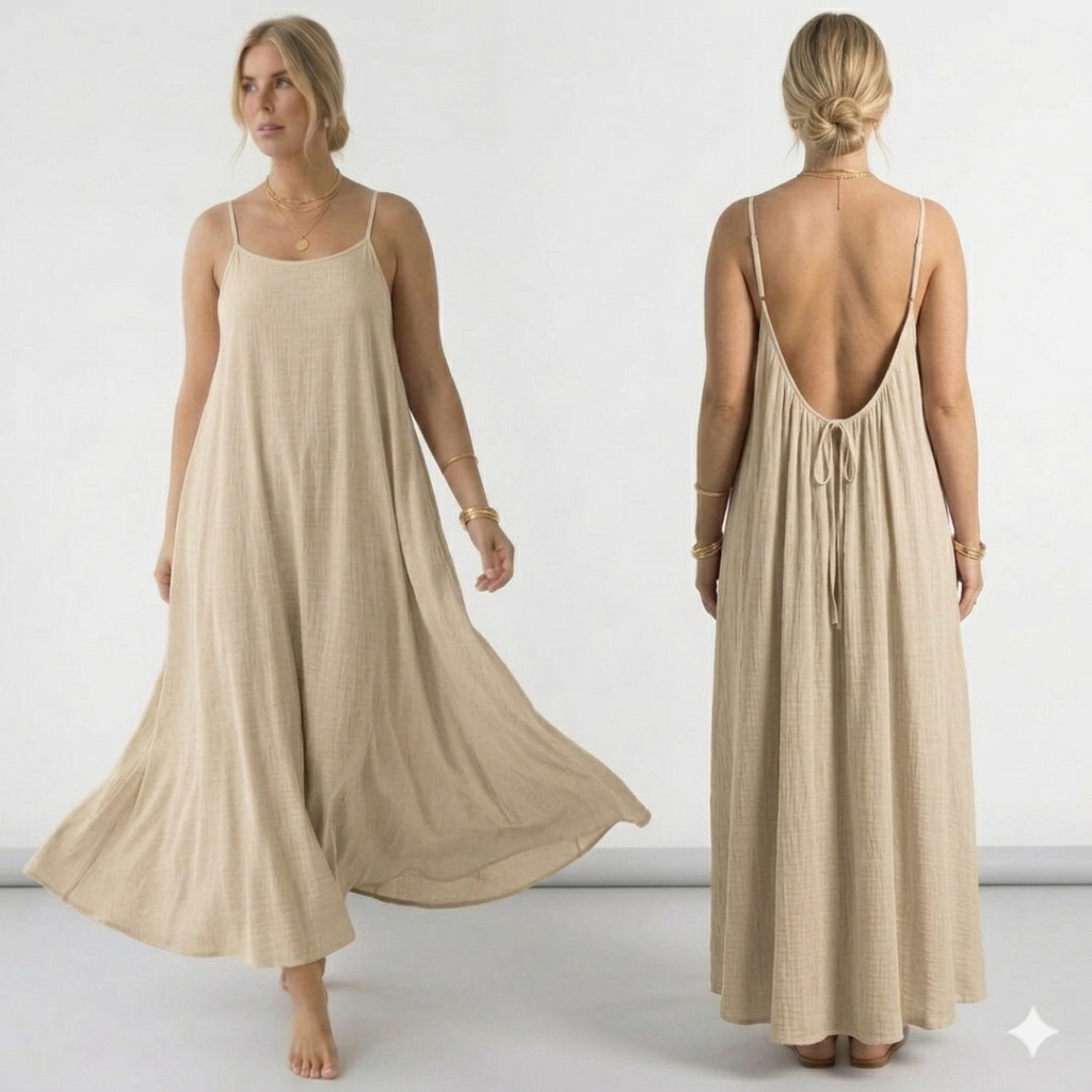 Lightweight and effortlessly elegant, this backless cami dress is designed to flow beautifully with every step. Featuring delicate adjustable straps and a flattering open-back design, it creates a soft, feminine silhouette while remaining comfortable to wear. The breathable, smooth fabric drapes naturally over the body, making it ideal for warm days, vacations, or relaxed evenings out.